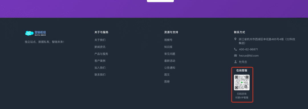 展示了“联系我们”或类似页面上,专门用于展示在线客服的区域,包含二维码和详细的说明文案,为用户提供了明确、集中的咨询渠道。