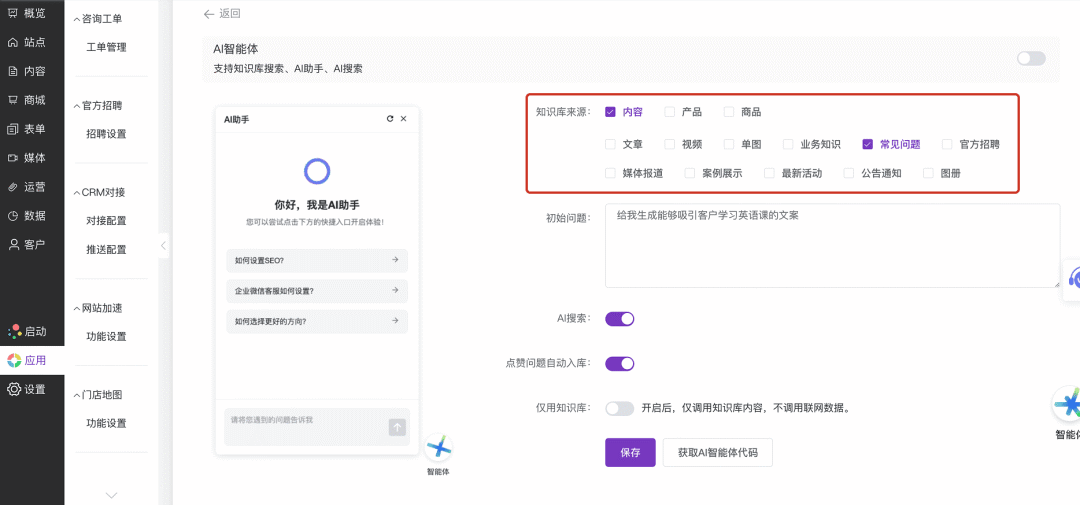 确保官微中心App为1.39.3或更高版本。在App内进入「官微中心」->「应用」->「AI智能体」,开启“AI知识库”功能,并勾选希望纳入智能搜索范围的内容类型(如文章、常见问题等)。