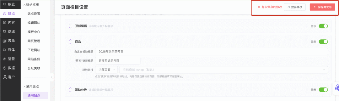 用户登录后台,进入任意需要进行编辑的页面(如“页面栏目设置”、“网站装修”等),对栏目、内容或样式进行修改。