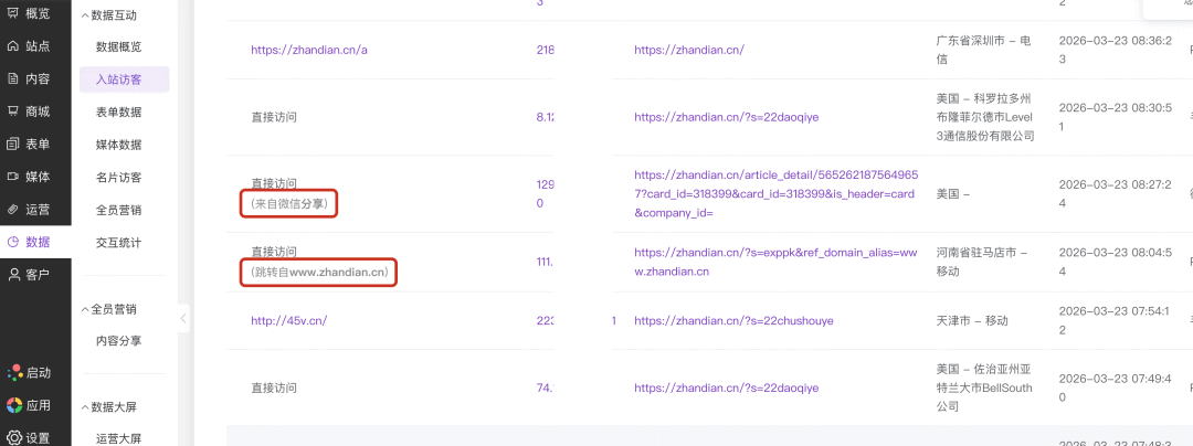 在“入站访客”列表页面,浏览“来路”这一列。您可以观察到两种新的标注格式: