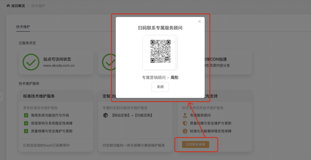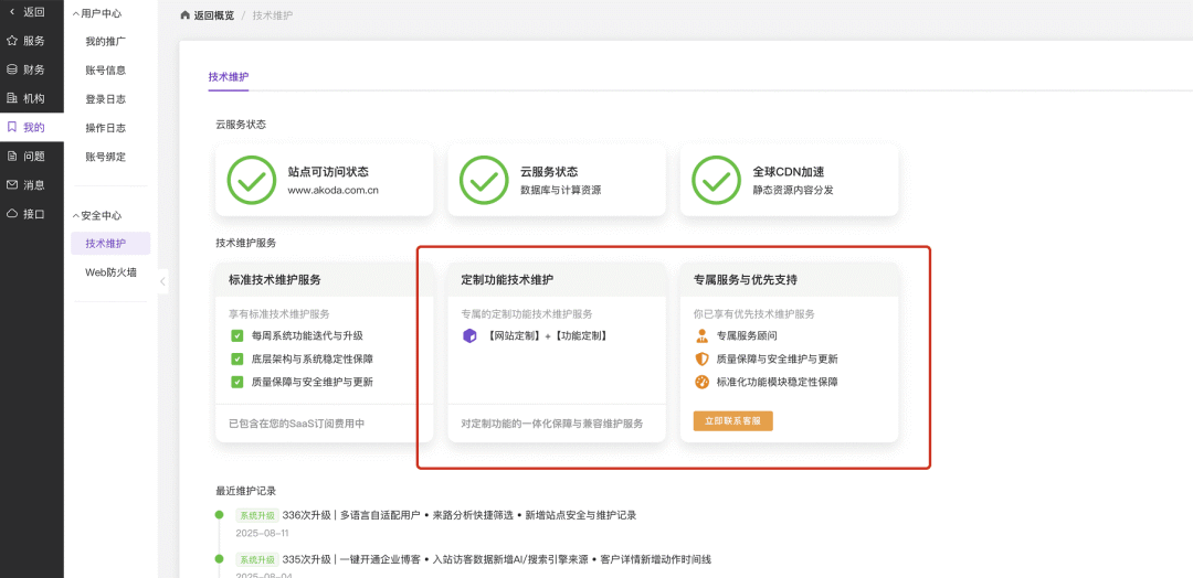 展示了优化后的“技术维护”页面。页面中除了常规维护记录外,新增了两个独立的、视觉上突出的版块,分别是“定制功能技术维护”和“专属服务与优先支持”。在“专属服务”版块中,有一个被红色方框清晰标注的“立即联系客服”按钮。