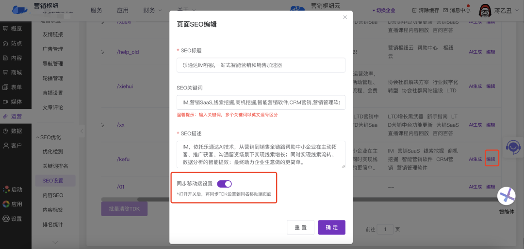 优化SEO编辑功能,新增“同步移动端设置”开关,实现PC与移动端页面标题、关键词、描述一次编辑、双端自动同步,提升运营效率。