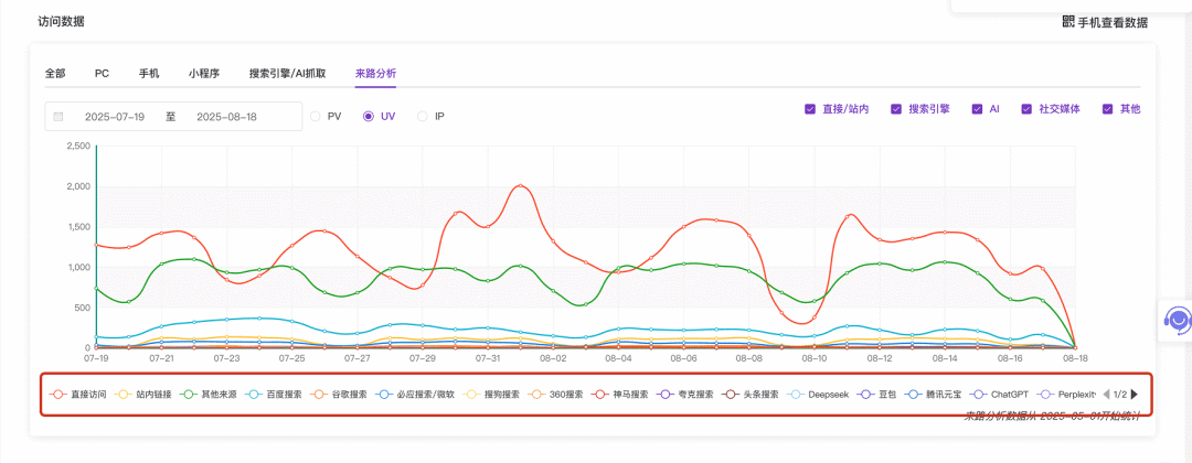展示了“来路分析”功能页面的截图,聚焦于核心的趋势图表区域。在图表的底部,可以清晰地看到“来源类型”的图例,其顺序依次为“直接/站内”、“搜索引擎”、“AI”、“社交媒体”、“其他”,这与页面顶部或侧边导航栏的来源分类顺序完全吻合。