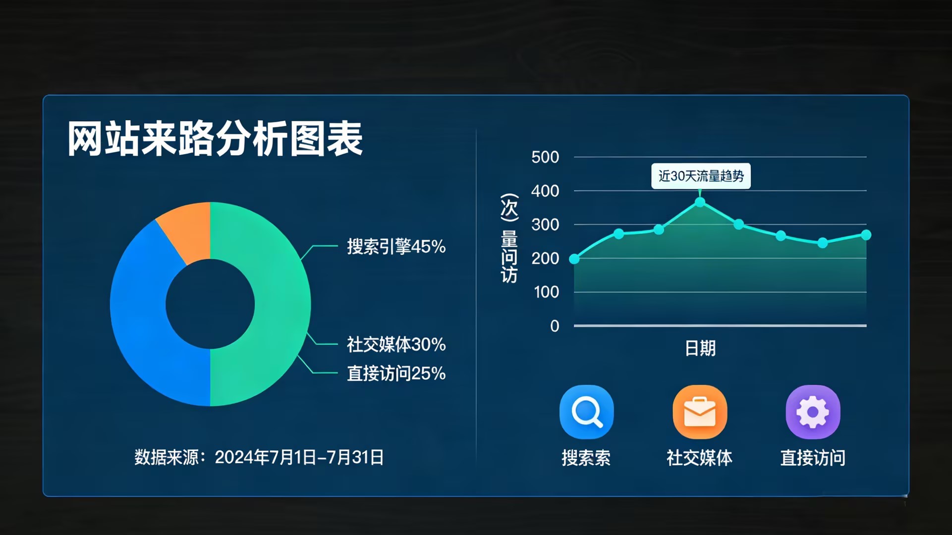尝试点击导航栏中的不同来源分类(如“搜索引擎”、“社交媒体”)。观察图表中对应的数据系列是否高亮或变化。由于图例顺序与导航一致,您可以非常快速、直观地定位和理解每个渠道的流量趋势。