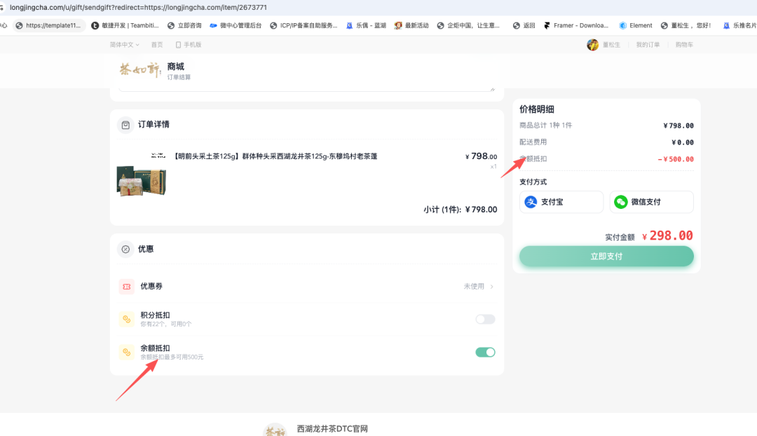 在优惠模块选择可用优惠券、开启积分/余额抵扣,查看抵扣后金额变化
