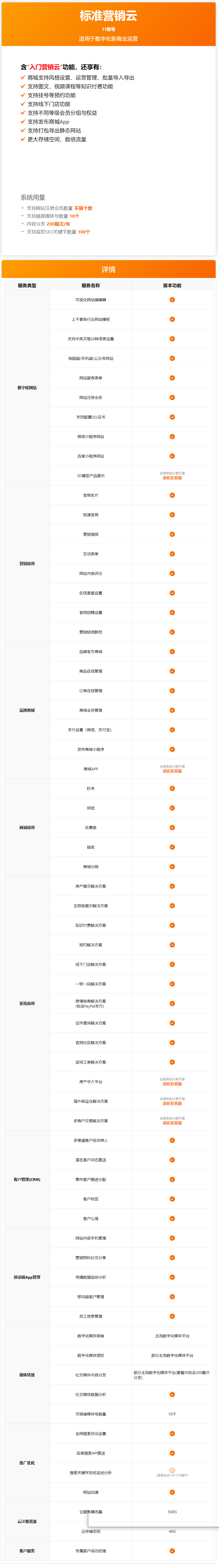 按年订购,包含11账号,13200元/年。可搭建独立网站营销系统外,还将拥有官方品牌商城与小程序商城,实现全网、全场景在线购物和分销裂变,适用于品牌企业、电商与准备从事社交电商的企业实现综合的数字化运营。