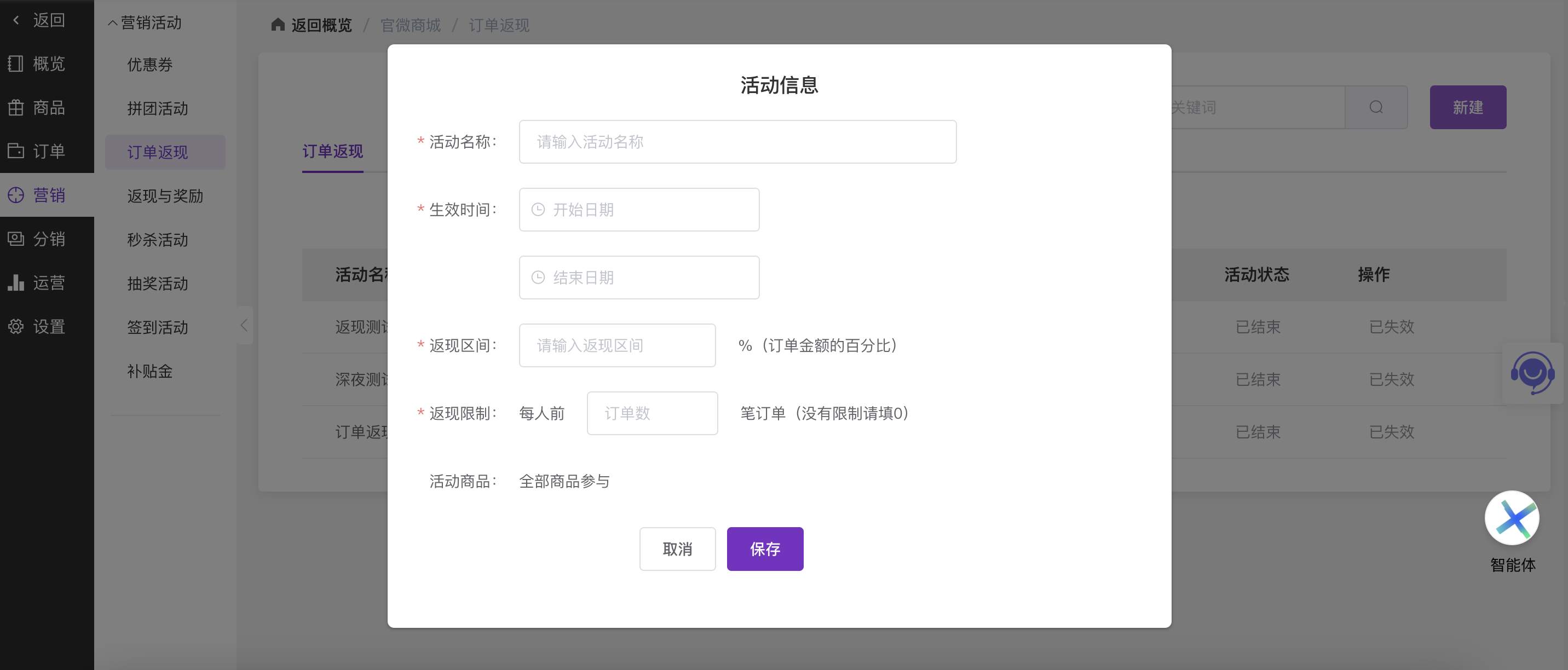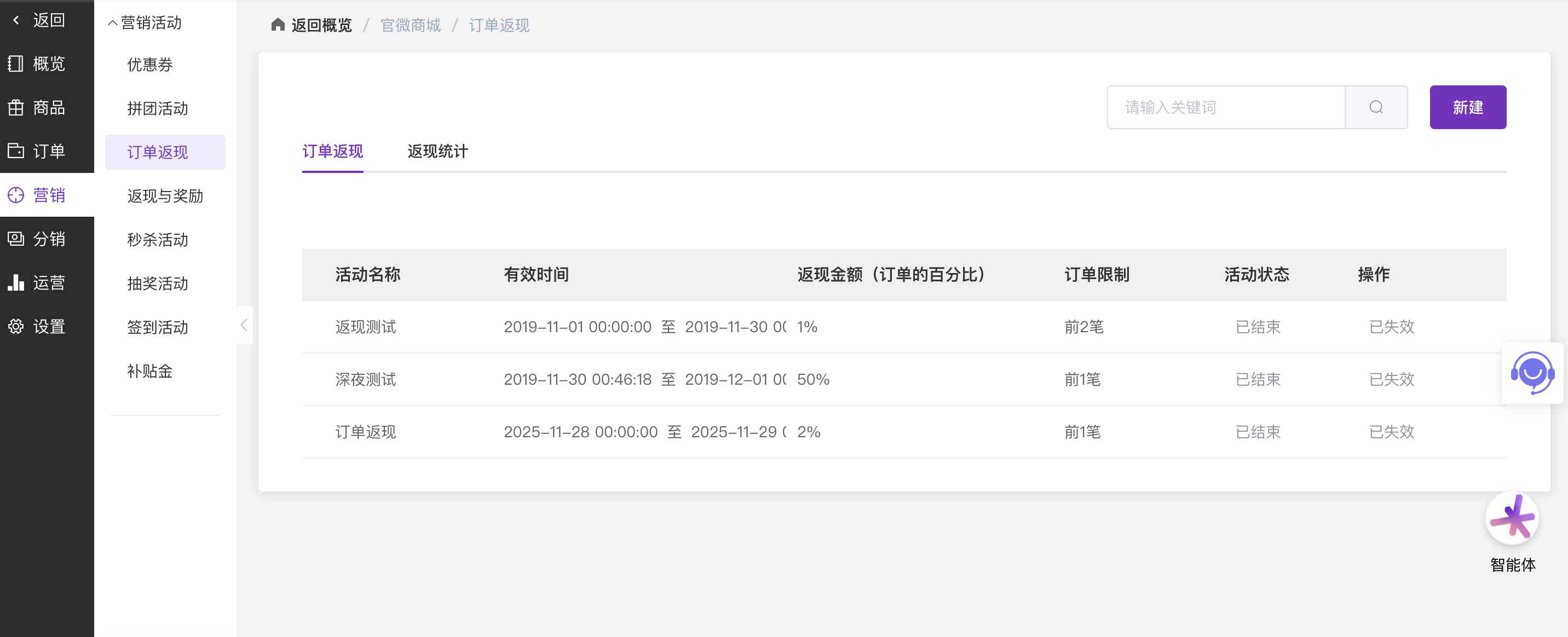 通过"官微中心 - 营销 - 订单返现"进入订单返现管理界面
