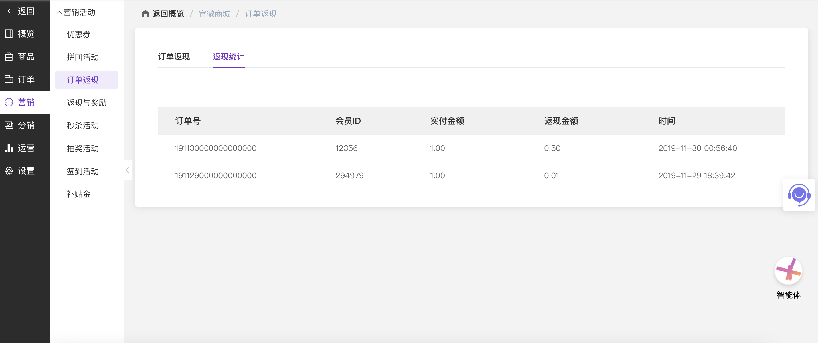 在"订单返现"标签页查看实时返现记录,监控活动效果