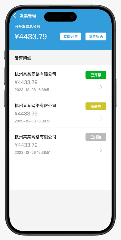 系统自动核算“可开票总金额”,避免用户手动计算或超额申请。开票历史与状态(待处理、已开票、已拒绝)实时可见,让用户对整个开票进度心中有数。