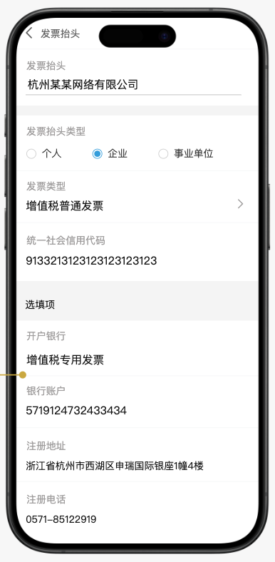 (图示说明:编辑企业发票抬头的界面,可选择“企业”类型、“增值税专用发票”,并需填写统一社会信用代码、开户银行、银行账户、注册地址等完整信息。)