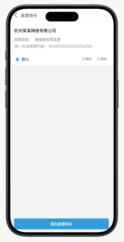 (图示说明:发票抬头管理列表页,展示已添加的抬头信息(如“杭州某某网络有限公司”),可进行“编辑”、“删除”和“设置默认”操作。)