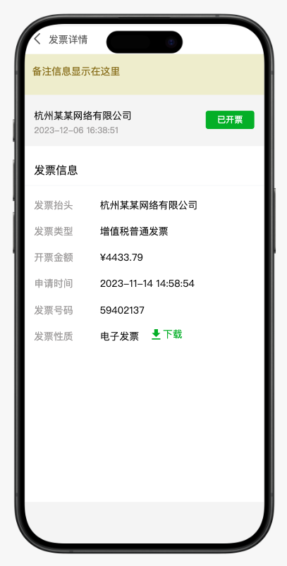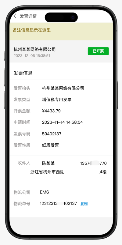 提交后,可在发票管理主页的“发票明细”列表中查看申请状态。当状态变为「已开票」时,点击该条记录即可进入详情页,查看完整发票信息。若为纸质发票可复制物流单号;若为电子发票可直接点击「下载」。