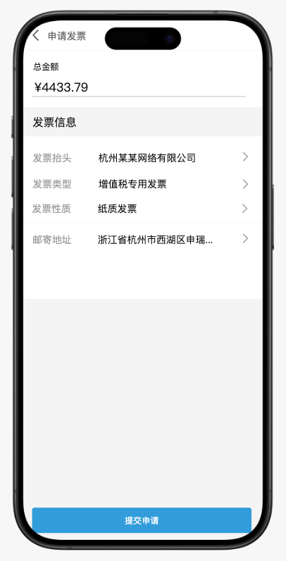 (图示说明:“申请发票”页面,显示总金额、发票抬头、发票类型(增值税专用发票)、发票性质(纸质发票)及邮寄地址等信息,底部有“提交申请”按钮。)