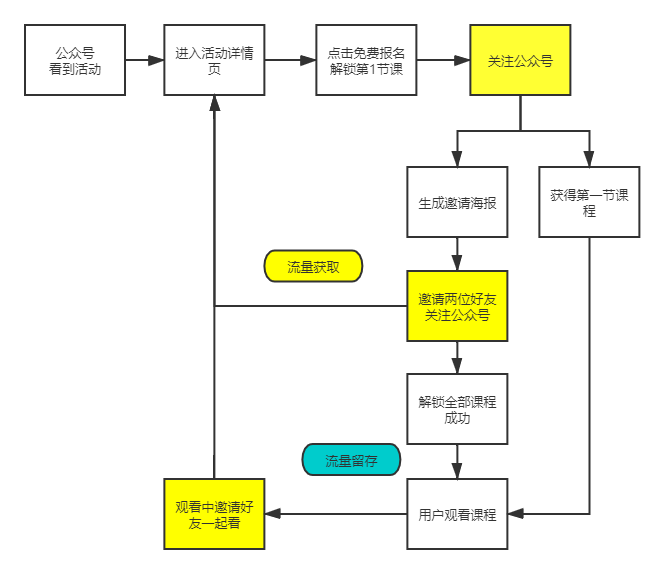 构建具备自增长能力的流量产品平台需要考虑丰富的内容支持,设置多种拉新玩法,将部分资源开放给用户免费获取,具备课程播放能力,考虑为多个公众号引流问题,并设置后台进行配置。同时,可以循序渐进、小成本