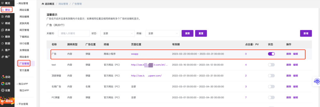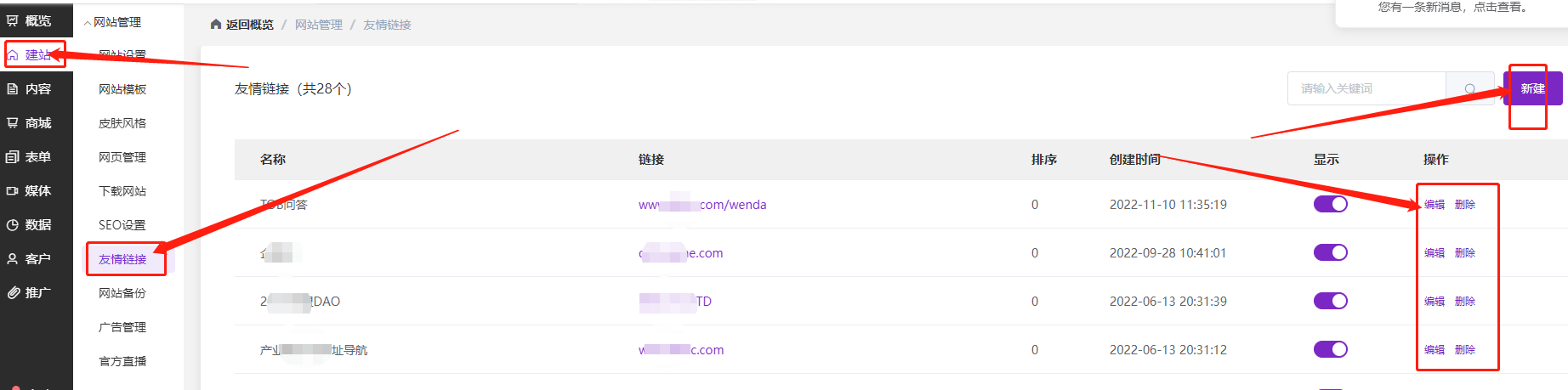 管理操作路径:官微中心后台-建站-网站管理-友情链接,在友情链接管理界面可以编辑、删除已添加的友链或者新建友链。