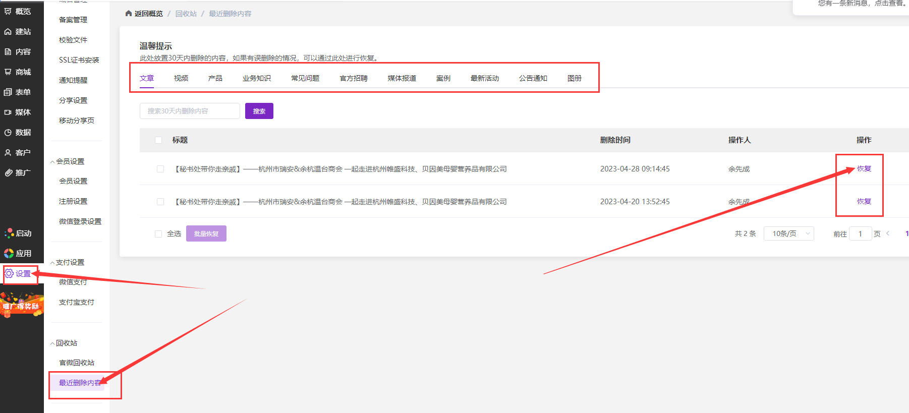 文章、视频、案例、产品等等内容删除后可以在回收站中找到并恢复。操作路径:官微中心后台-设置-回收站-最近删除内容,在相应的内容分类栏目中找到最近删除的,点击“恢复”即可找回。注意:此处放置30天内删除