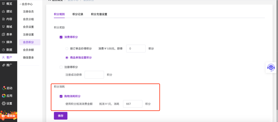 通过以下几个简单步骤,可以搭建并配置出一个积分商城。第一步: 设置积分比例为了「用积分购买」商品,我们首先需要开启使用积分购买、并设置积分与现金的抵消比例。操作路径: 官微中心 - 客户 - 会员