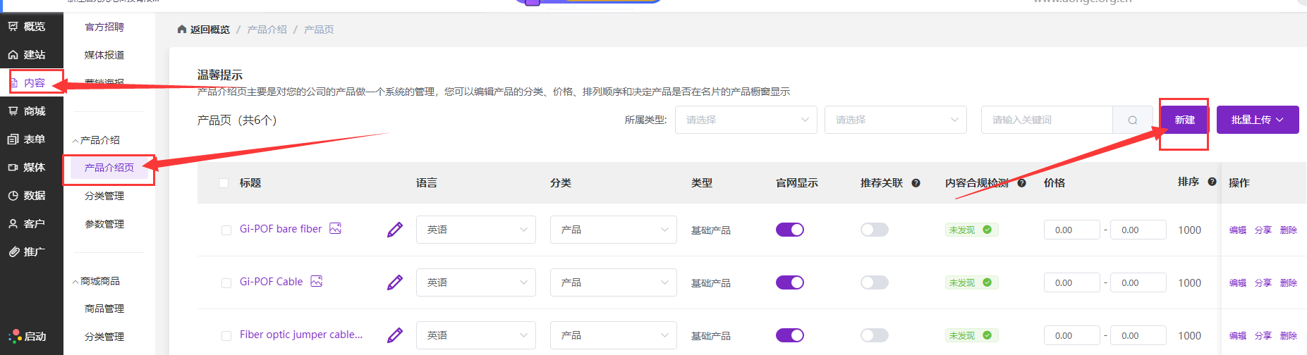 推荐关联商品设置操作路径:1、官微中心后台-内容-内容关联-关联推荐,“推荐关联商品介绍”板块。在语言栏可以选择某个语言版本的网站,点击“添加内容”。2、在添加关联商品窗口点击勾选产品,选择好之后点“