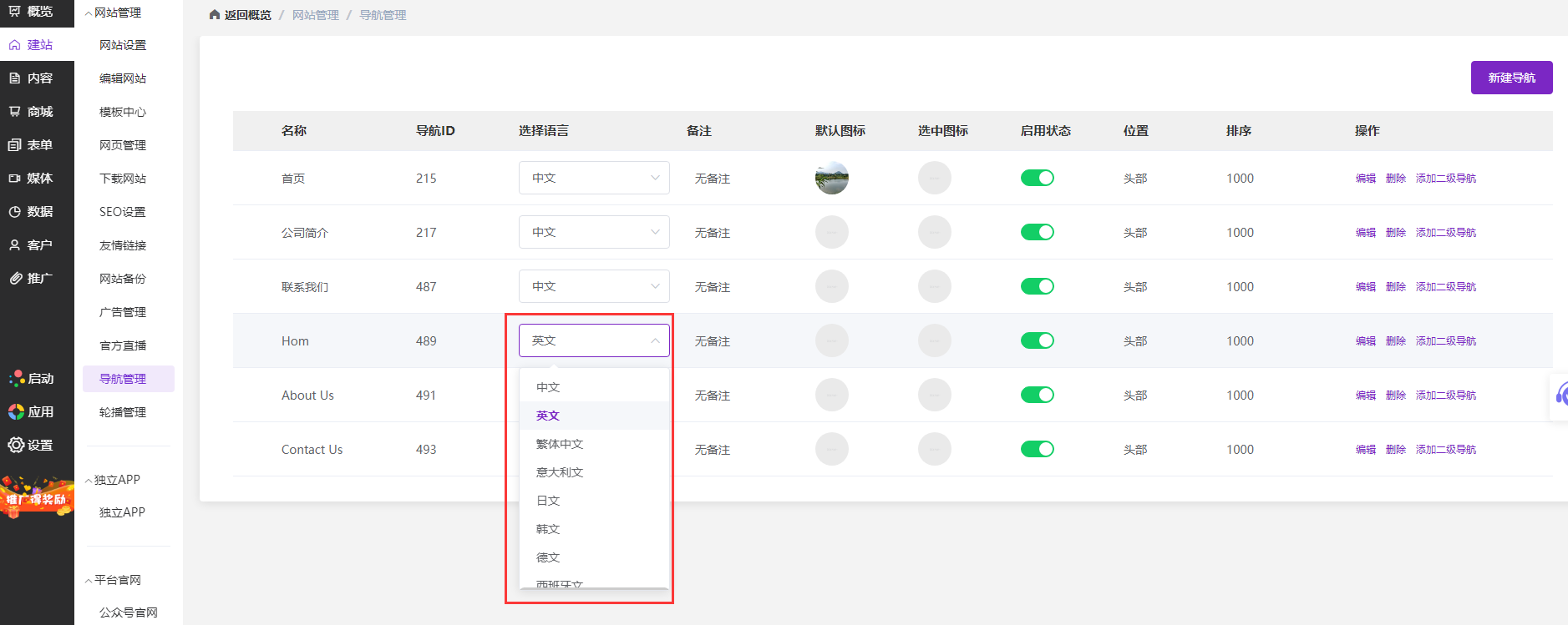 我们为其增加了语言版本的设置,不同语言版本的网站中、导航模块将读取对应语种的导航数据来进行显示。操作路径:1、官微中心 - 建站 - 导航管理 如下图所示,可以在 选择语言 这栏,对每一条导航记录设置