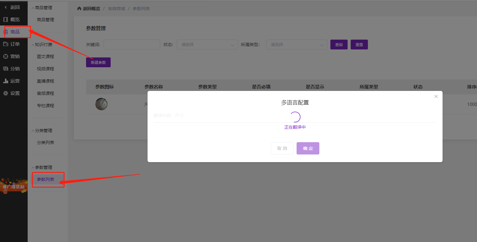 参数名增加翻译功能,方便对多语言网站的参数名进行翻译。操作路径: 官微中心 - 商城 - 商品 - 参数列表 找到 参数名称 对应的列,单击 “翻译” 即可。翻译之后显示的多语言配置名称。可以直接