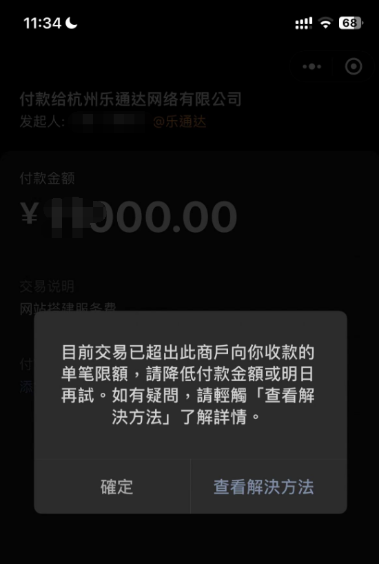 微信扫一扫支付大额订单时出现“目前交易已超出此商户向你收款的单笔限额,请降低付款金额或明日再试。”的提示。
