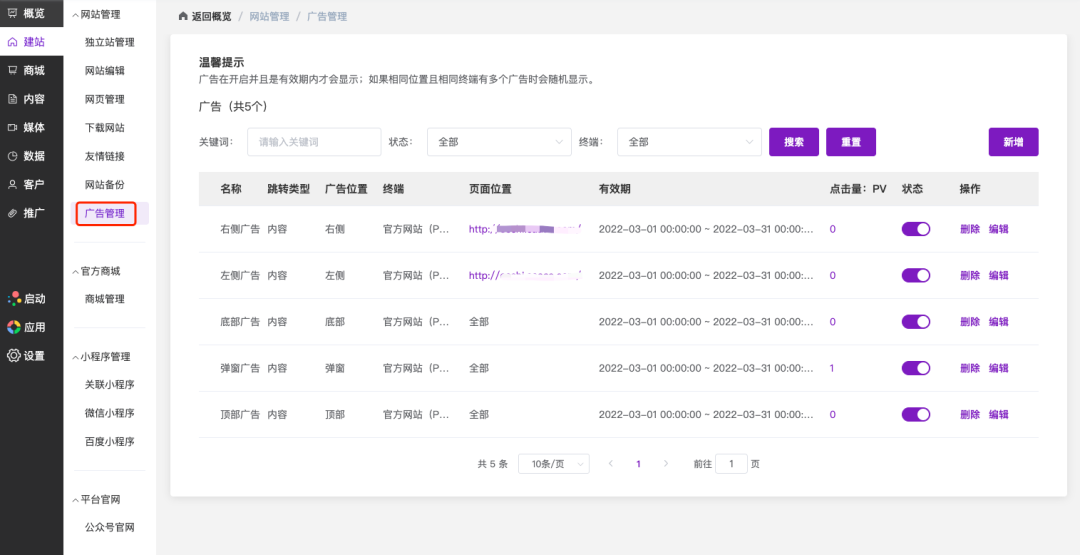 官网支持广告管理功能,有顶部、底部、弹窗、左侧、右侧5个广告位。包括官方网站(PC)、官方网站(移动)、商城小程序。操作路径:官微中心 - 建站 - 广告管理1)进入 广告管理。 2)单击 新增 可以