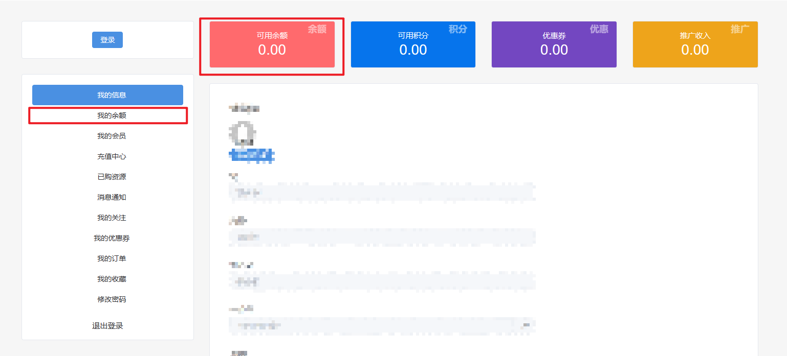 我想隐藏掉网站个人中心的“我的余额”或者其他模块,如下图所示: