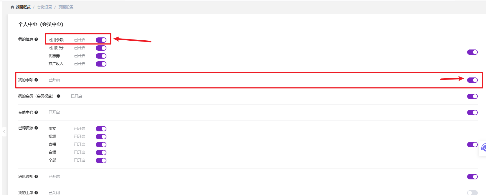 如果需要隐藏掉相关模块,可以进入营销枢纽后台—【设置】—【页面设置】—【个人中心】,找到需要关闭的模块,关闭即可: