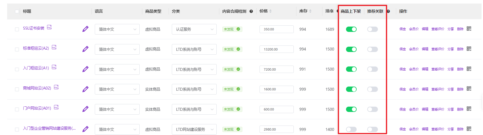 商品上传后,可以在【商品管理】中对商品进行上架/下架/推荐/删除等:
