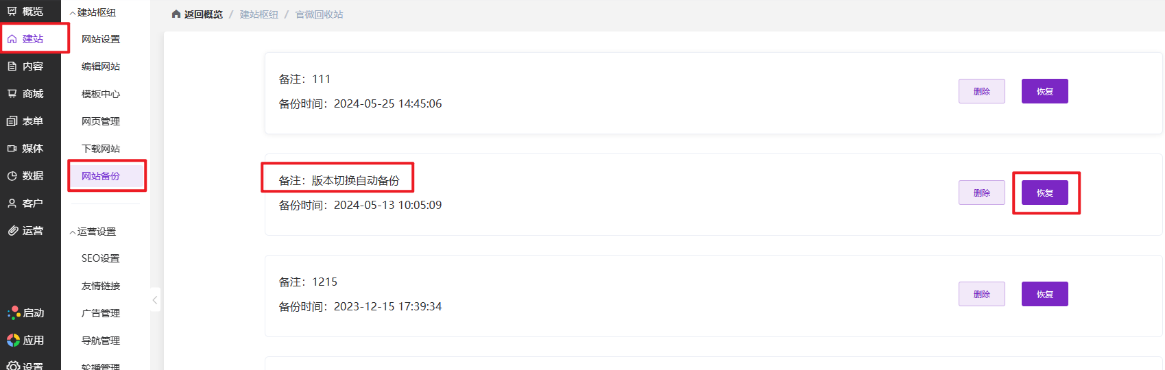 实际上,系统在更换模板的时候会自动备份,我们只需要进入营销枢纽后台—【建站】—【网站备份】,找到系统自动备份的数据,点击恢复,如下图所示: