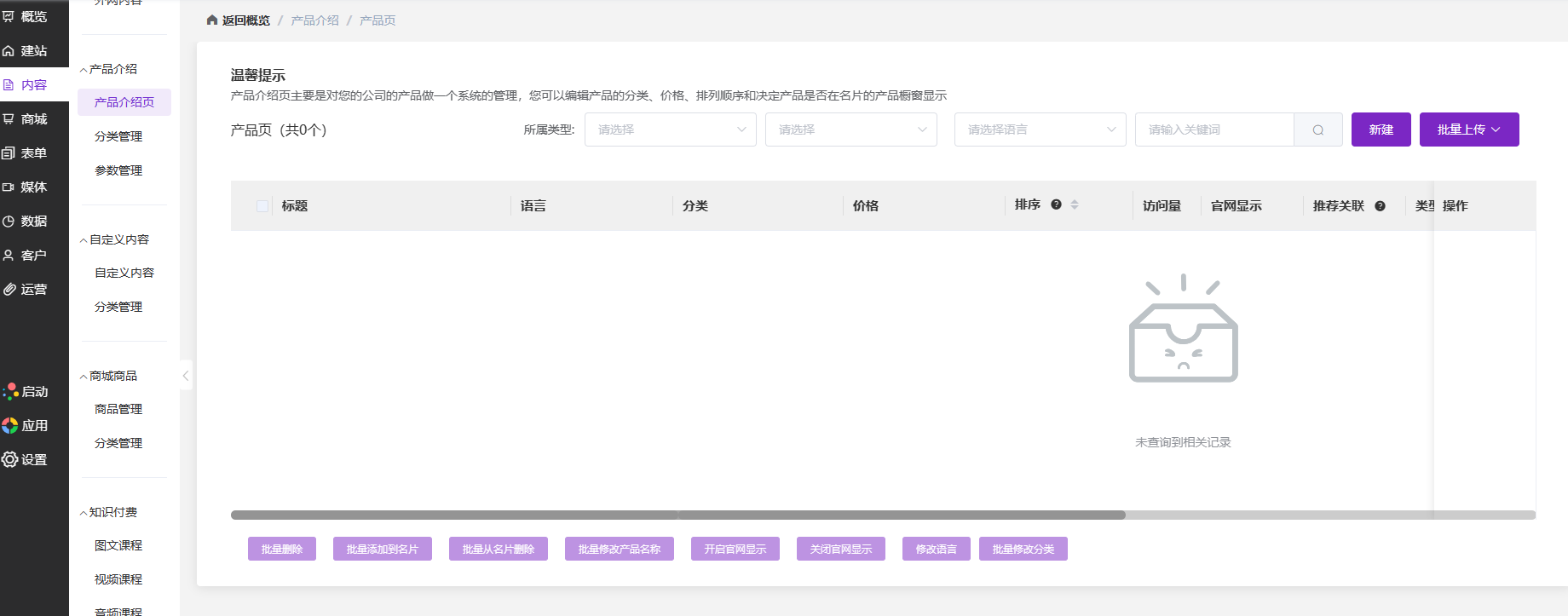 产品上传后,可以在【产品介绍页】中对产品进行推荐/删除等: