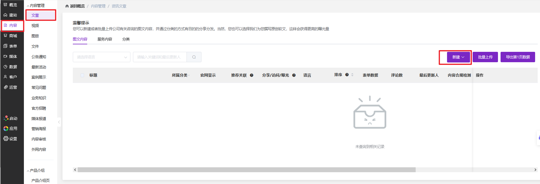 进入营销枢纽后台,点击【内容】—【文章】,如下图所示: