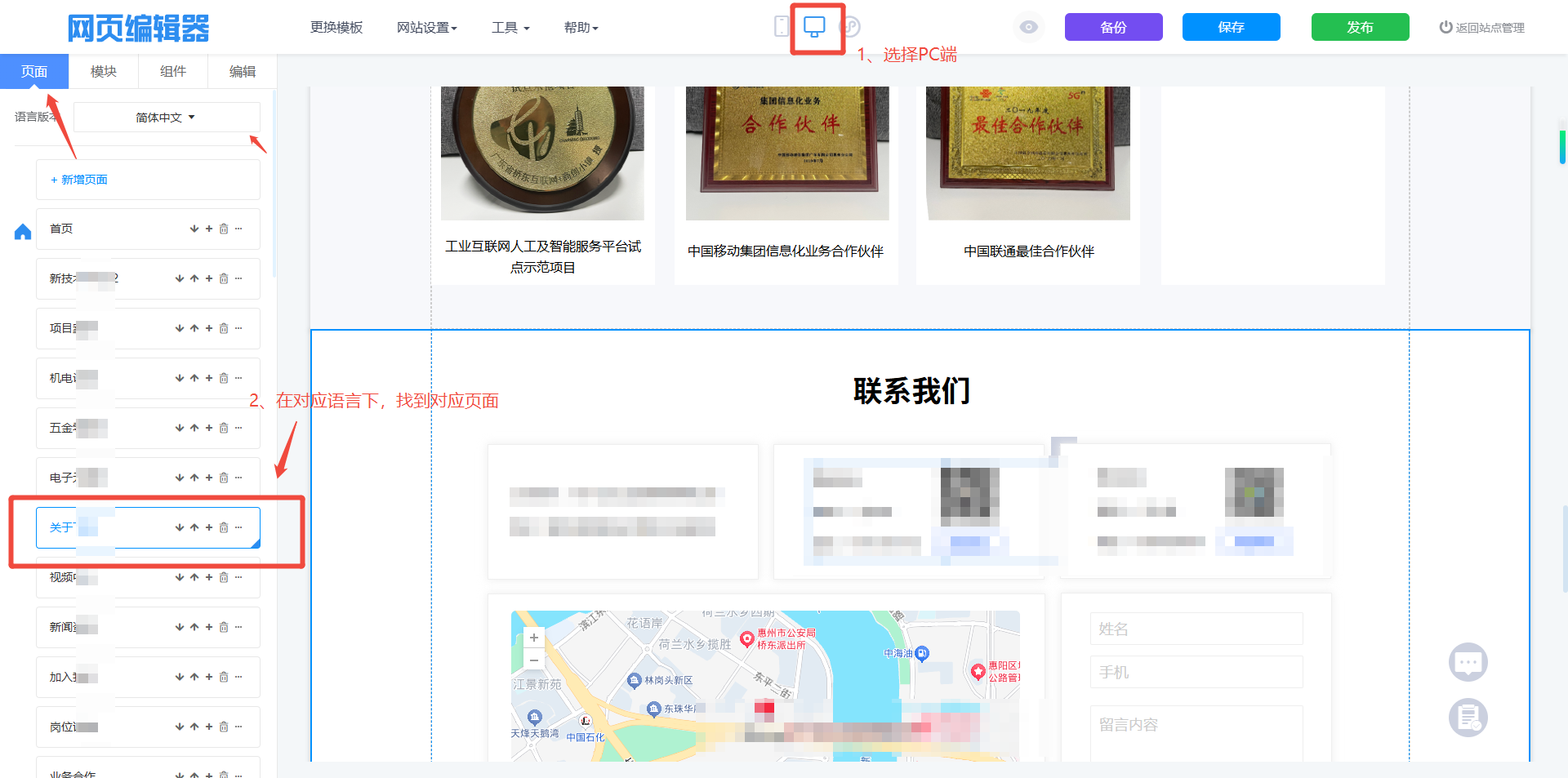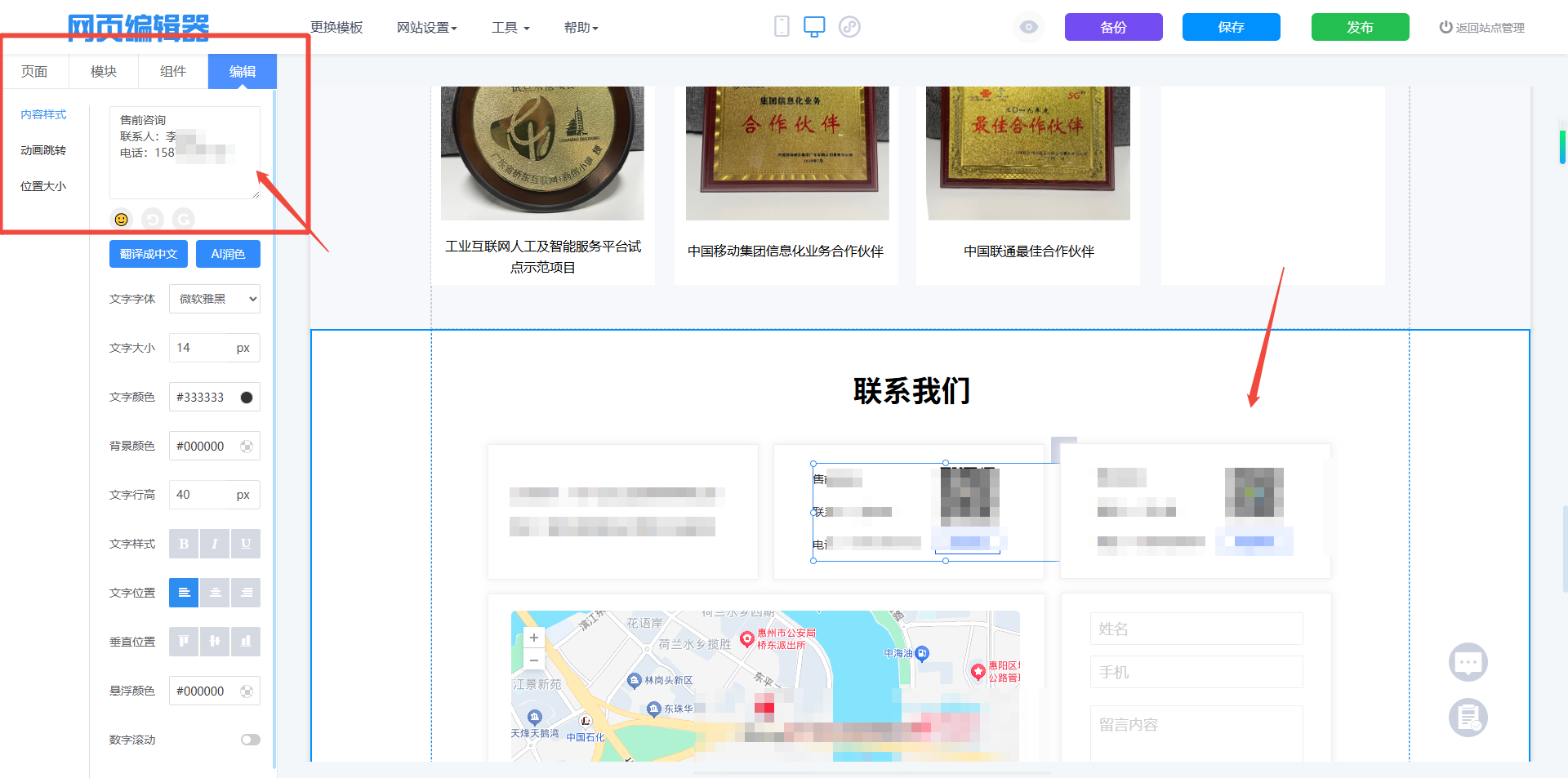 3、进入到对应页面后,浏览找到需要修改的模块,点击模块后对左侧输入栏内容修改,修改后保存发布即可同步最新网站内容。