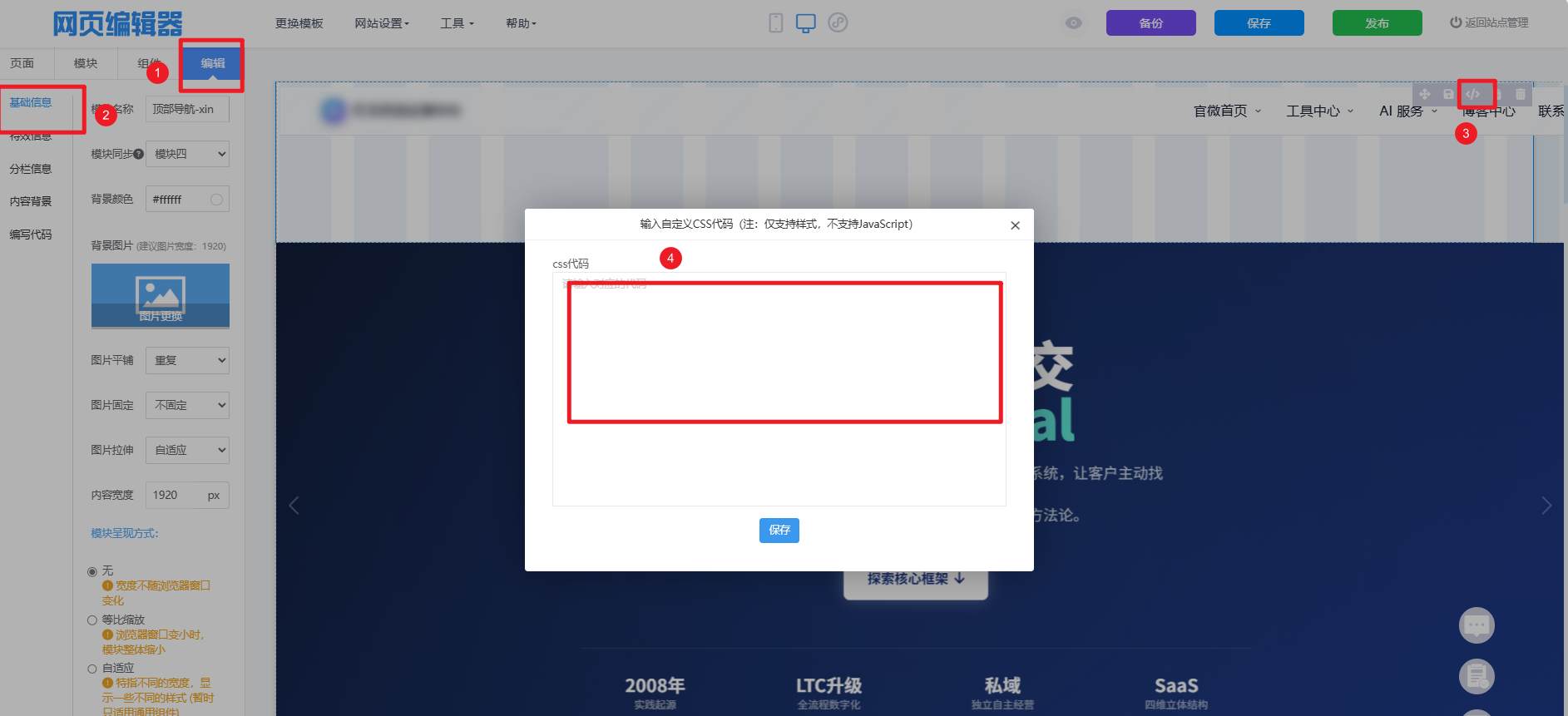 进入网页编辑器后,先在编辑器顶部找到“编辑”入口,确保当前页面处于可编辑状态,这一步是为了能够对当前页面的样式进行调整,在左侧设置面板中,点击“基础信息”,然后在该区域内找到“编写代码”相关选项,这是页面允许添加自定义样式的位置。