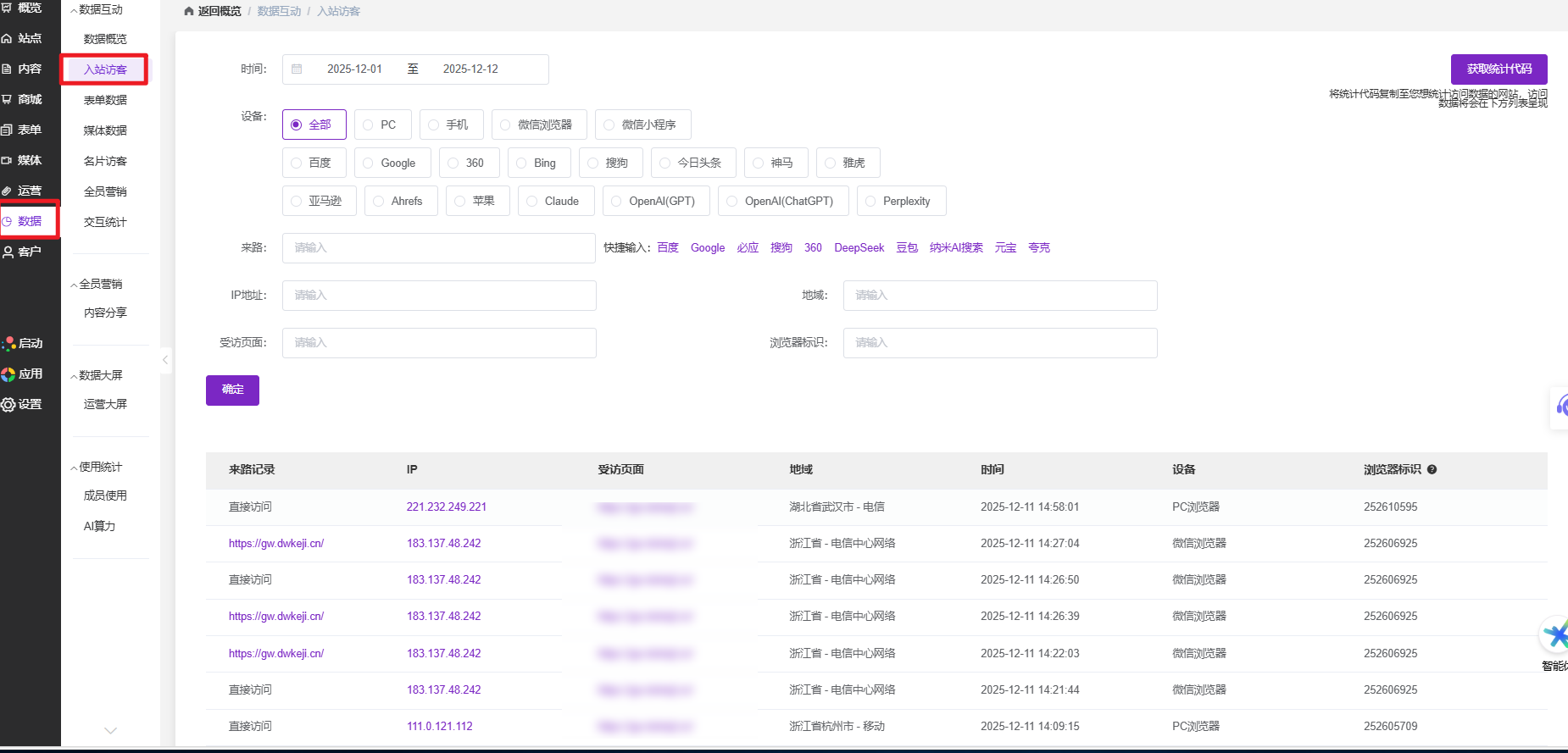 进入后台后,在左侧菜单中点击“数据”,再进入“入站访客”页面,这里会按时间顺序展示所有访问你网站的访客记录,包括来路记录、访问 IP、访问页面、所属地域、访问时间、使用设备以及浏览器标识,你可以通过上方的时间、设备类型、搜索引擎(如百度、Google、OpenAI、DeepSeek 等)进行筛选,判断访问是否来自真实用户还是特定渠道。