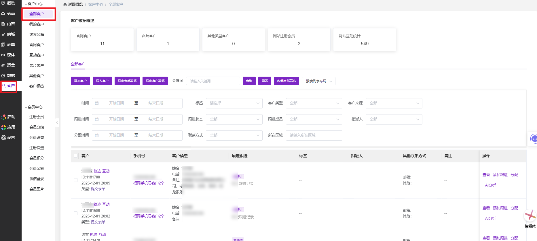 当访客在网站中填写了表单,或者在交互过程中授权了手机号后,系统会自动将该访客识别为有效客户,并同步进入“客户”模块下的“全部客户”列表,你无需手动导入或二次操作。