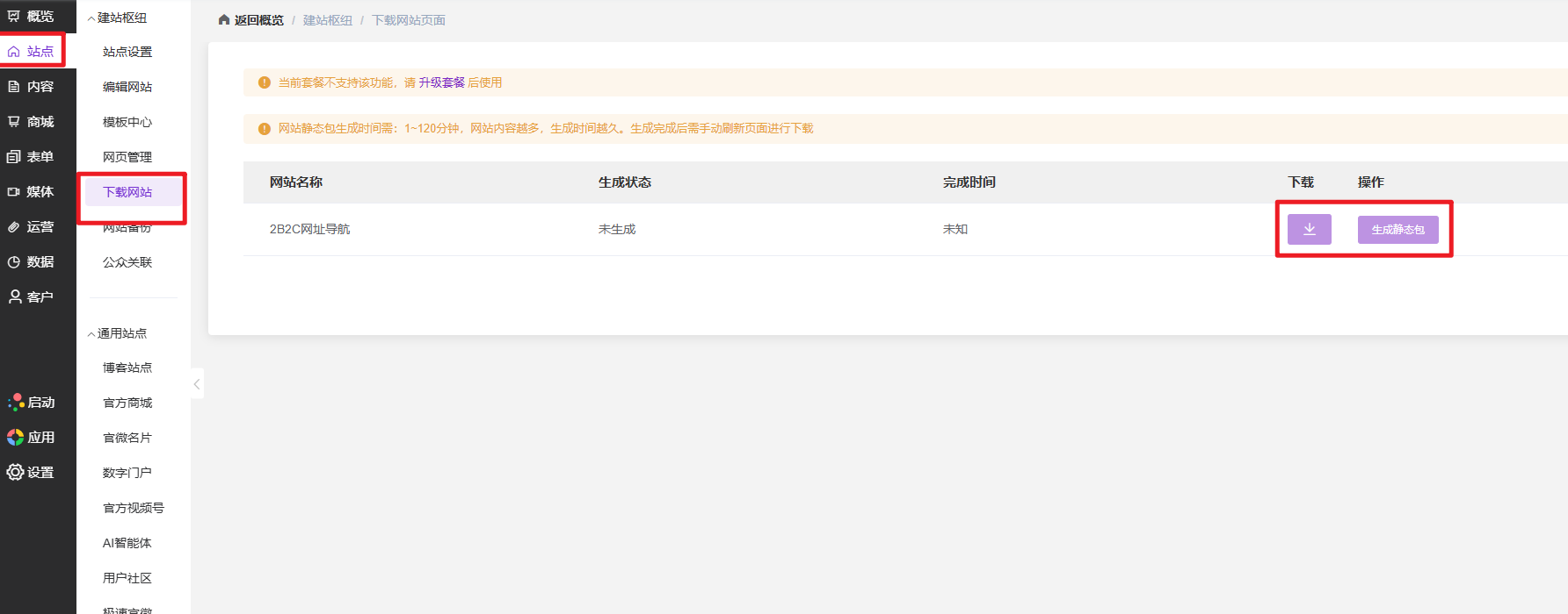 在下载网站页面中,找到对应网站条目,点击右侧的 “生成静态包” 按钮。